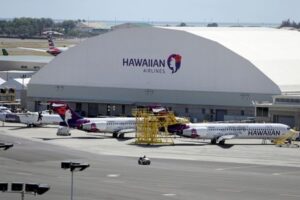 Hawaiian Airlines airplanes sit idle on the runway at the