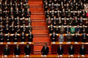 FILE PHOTO: Chinese President Xi Jinping (C), Vice President Wang Qishan, Politburo Standing Committee member Zhao Leji, National People’s Congress (NPC) Standing Committee Chairman Li Zhanshu, Premier Li Keqiang, Politburo Standing Committee member Wang Huning and Vice Premier Han Zheng arrive for the closing session of the Chinese People’s Political Consultative Conference (CPPCC) at the Great Hall of the People in Beijing, China March 10, 2021. REUTERS/Carlos Garcia Rawlins/File photo
